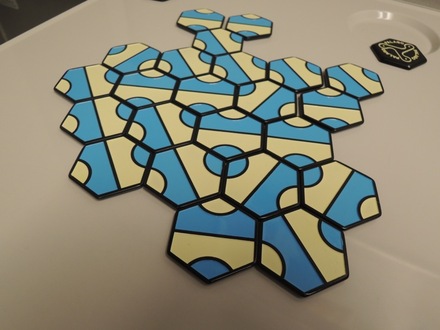 タイルを置いていくアブストラクトゲームです。タイルが1種類しかないという美しいゲームです。手番に2枚ずつ置いて自分の色を閉じれば勝利です(ただし最少の円を除く)。新幹線のテーブルでも問題なく遊べますね。2回遊びましたが、結果は覚えていません。