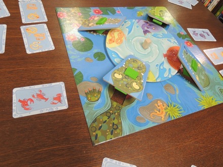 中央で回転する円盤を自分のワニを傾けて良いタイミングで止めるゲームです。止まった所と同色のカードを獲得します。円盤は90度ずつに4色に分かれているので、自分が取れるときに他のプレイヤーも別の色が取れることがあります。その辺を考えながら素早く考えて損をしないようにするのです。ひどいときには自分以外の全員がカード獲得なんてこともあります。獲得したカードは色別に計算しボーナスもあります。なかなか良くできているのではないでしょうか。