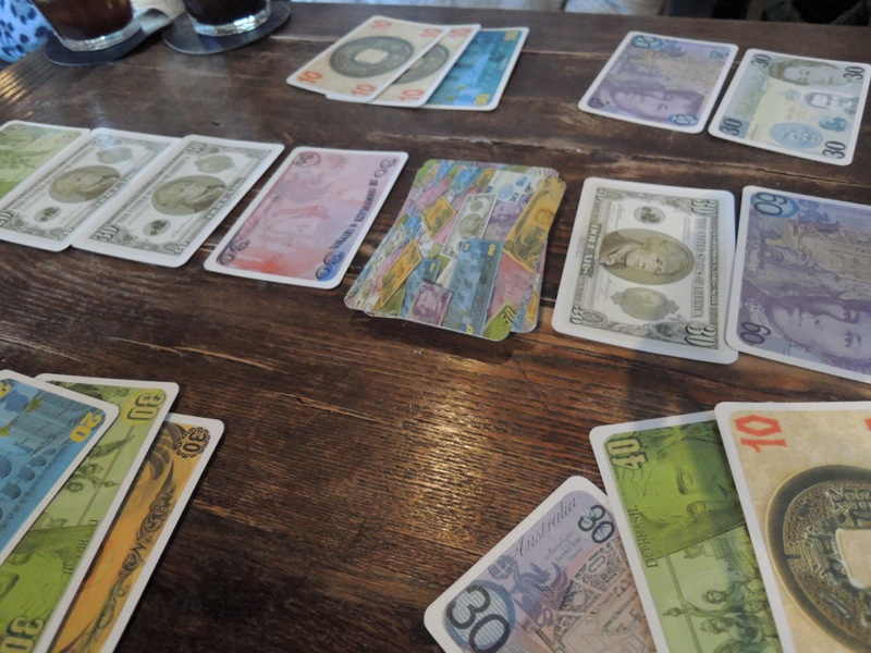 「マネー」がやりたいという要望で計3回遊びました。7種類の通貨を5人で取り合うので1−2種類にするのが普通だと思っていましたが、1戦目でまさのぶさんは4種類も集めてうまく得点を取っての勝利。この勝ち方は初めて見ました。多くの種類を集めるということはそれだけ他人も妨害していることになるので、悪くないやり方かも知れません。