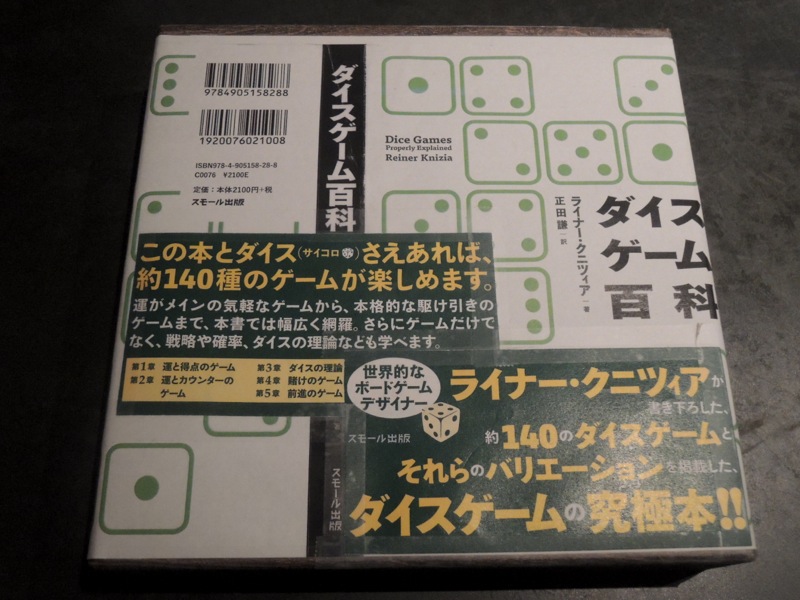 このあとの2次会で、噂に聞いていた「ダイスゲーム百科」をすべて遊べるセットをみせてもらいました。あかまどうしさんが自作したもので、本と必要な用具のすべてが綺麗に箱に入っています。箱の蓋は、本のカバーをカラーコピーして貼ったそうです。