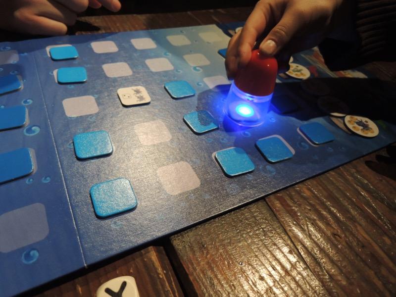 ちょっと薄暗いシネマアミーゴの雰囲気にぴったりだと思って持ち込みました。ブラックライトを光らせると、おーっという歓声が上がります。クニツィアがメカニクスから考えたゲームだと言っていましたが、見事にテーマと合致しています。結構バースト率が高いので、ある程度は慎重に進めるのが良いでしょう。今回は浅瀬のタイルがあらかた取られてしまい、終盤はかなり辛かったです。ボーナスタイルが尽きて終了。