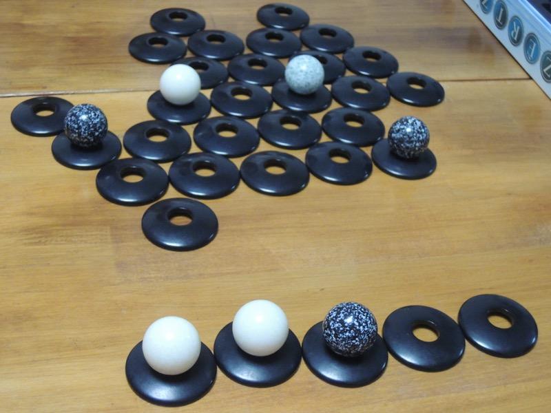 ギプフシリーズでは初期には一番好きだった「ゼヘツ」です。このゲームを始めて遊んだのは2000年に行われた第1回のゲームマーケットのときで、その記憶はなぜか鮮明に覚えています。ゼヘツはビリヤードで言えばナインボールみたいなあまり形勢のないゲームです。とはいっても完全に形勢がないわけではなく、獲得したマーブルによって、その後の手筋が変わります。とりあえずは勝利への最短距離である白のマーブル4個を目指すのが良いでしょう。相手に黒を取らせて自分は白を取るというように仕向けます。慣れてくると複数のジャンプを仕掛けられたり、孤立させて取ったりということができるようになります。キャメロンブラウンの「リミット」がちょっと似ていますが、自分はゼヘツの方が好みです。