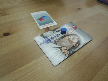 裏面が赤青白の3色のカードをよく混ぜて、手札を3枚ずつ持ちます。手番には1枚出してカードの指示に従って患者の体温を上下させます。そして1枚補充して手番は終わりです。赤のカードは体温上昇(1-4度)、青は体温下降、そして白は特殊カードです。体温は35度から41度の間でなければならず、また白のカードの直後に白は出せないという縛りがあるので、手番に出せなくなってしまうこともあります。そのときは1枚捨てて以降手札2枚で続けます。さらに出せなければ、また手札が1枚減り、手札がなくなると脱落です。最後まで手札を持っていたら勝ちです。