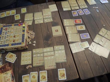 「アメンラー」と似ているようで異なる部分も多いです。現金カードを整数分割のごとく分けていくのは非常に面白いのですが、得点や土地カードなどがちょっとバランスを崩している気もします。もちろんこれは今回の印象なのですが、すごく良いゲームに一歩届かない惜しいゲームなのかもしれません。みんなの「久し振りにドイツゲームをやったっていう感じ」という感想が印象的でした。