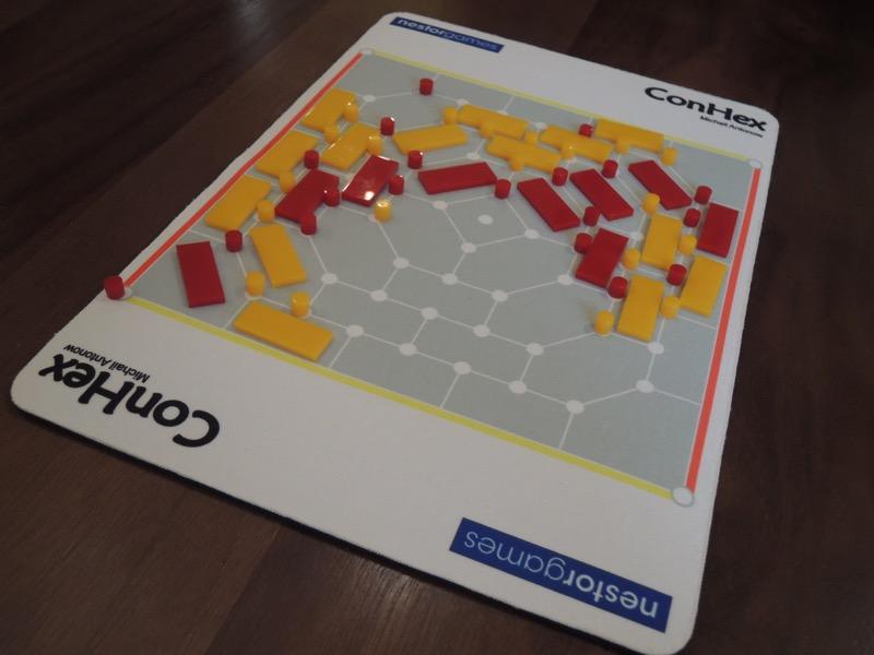 まずは初参加のkobaさんのリクエストで「コンヘックス」です。エリアマジョリティーとコネクションゲームの融合ということで、比較的わかりやすいアブストラクトゲームだと思います。中央付近を突破して優勢だったのですが、左側で攻めきられて負けてしまいました。