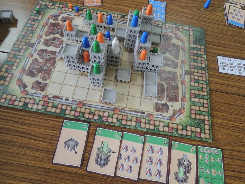 ひろぴさん&カヤさんと一緒に遊ぶ機会がなかなかないのですが、クラマーのアクションポイント制のゲーム「トーレス」を遊びました。第2版となるリオグランデ版で、珍しくリオグランデ単独での出版だったみたいです。10回の手番ではそれぞれ5アクションポイントが与えられています。4、7、10手番の終わりに決算があり、城の底面積と自分の騎士がいる高さの積が得点になります。ただし、城の高さは城の底面積を超えてはならず、また城同士をつなげたりもできません。よって最初の8つの城から城の数は増減することもなく、この辺りは面白みに欠けると思います。城の配置や騎士の移動は1アクションポイント、新たな騎士を配置するのが2アクションポイントなどとなっています。他にも、単純に1アクションポイントで1点というのもあります。このあたり「絶叫マシーン」みたいでなんだかなあという感じです。これだけだと完全公開情報のアブストラクトゲームなのですが、1アクションポイントでカードが引けます。これでルール上ではできないことがいろいろ出来ます。