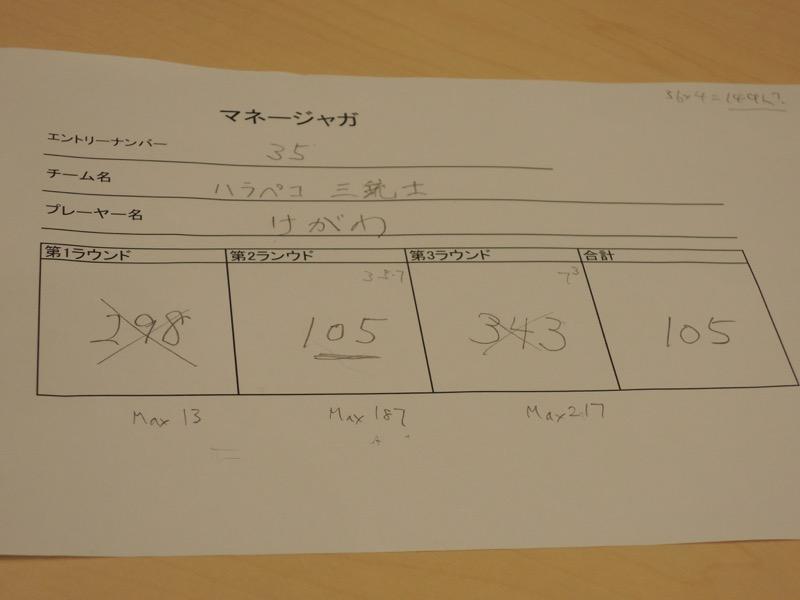 最後は全体ゲームのマネージャガです。全部で3回行い、総合得点の高かった1人の得点をチームの得点として提出します。ゲームはボードゲームの「マネージャー」のビッドシステムを応用したシンプルなもので、全員が好きな正の整数を紙に書きます。書いた数字がそのまま得点になりますが、自分より小さい10以下までの範囲の数字を書いていて、かつ失格していないプレイヤーがいなければ、自分も失格となります。一番小さな数字は1から始めるので、全員が書いたあとに1から数え上げていって、差が10以下での連鎖が続けば良いのです。差が10を超えるとそれ以上はすべて失格になるというわけです。