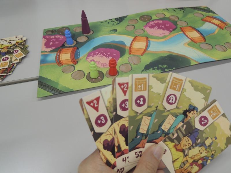 先週、ミスボドで遊んだ「サクラ」をもう一度遊んでみました。前回は4人でしたが今度は3人プレイです。皇帝に当たってしまうときの失点が大きいので、それを避けること、そして他人はぶつからせること、が主眼となり、序盤は皇帝は進退を繰り返すだけでまったく進みませんでした。徐々にカードの関係からか、進むようになり、桜の木の下での決算の時をめぐる熾烈な位置取りもあって、なかなか楽しめました。そこまで悪くないのでは、というのが今回の感想です。