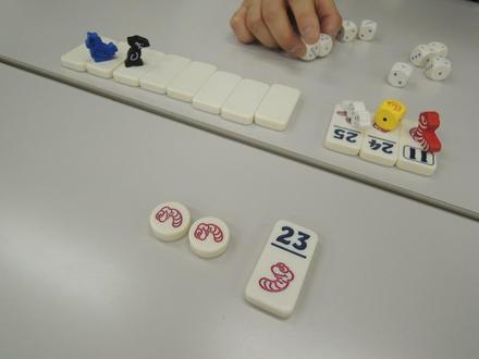 最近シュピールボックスの記事を読んで触発されて持ち込んだゲームです。3人プレイで自分以外は拡張は初めてです。序盤に首尾よくゴールデンダイスを獲得した双六小僧さんが、ゴールデンダイスを使って次々とタイルを獲得していきます。ハーミットさんと自分はともに1点の虫チップを気にしてしまい、1が2個以上だと確定させてタイルが取れずにバーストという情けない展開になってしまいました。以前はこの虫チップを軽視しすぎて失敗したのですが、今回はその逆です。特殊なコマがなかなか取れずに、特に11と13のタイルが最後まで残るという意外な展開でした。予想通り、双六小僧さんが圧倒的な勝利。ゴールデンダイスは途中で失ったのですが、そのあともタイルを獲得し続けていました。自分は単にダイス運が悪かったのでは、と思うほど虫の目がまったくでないことが続きました。