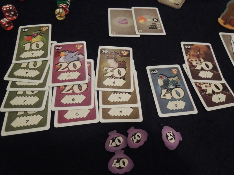 またダイスは大小2つあり、大きい方は1.5個分ということです。どうして2個分にしなかったのでしょうか。これも面倒なだけで、バランスを意識しすぎたきらいがあります。また、ラウンドに抜けたプレイヤーから特殊カードの2枚セットがもらえますが、どのセットを取っても同じじゃないか、って思う場面が多かったです。様々な点でバランスを良くしようとし過ぎて、結局焦点がぼやけたゲームになっているのは残念です。