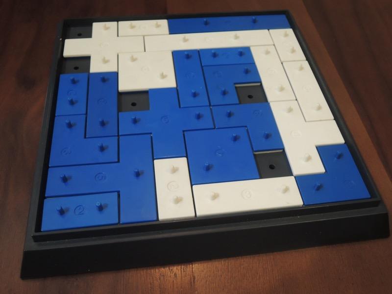 数ヶ月前にDDTレルムで購入した1983年製のアブストラクトゲームです。コマはすべて線対称なポリオミノで、それぞれの面が青と白のプレイヤーカラーになっています。目的は、自分の色による面積を相手よりも広くすることです。基本ゲームでは置いたポリオミノに辺で隣接する相手のポリオミノは裏返して自分のポリオミノにします。中級ゲームではコマを均等に分けて、手番では必ず相手のポリオミニに隣接するように置かなければならないというルールが加わります。上級ルールでは、さらに置いたポリオミノに隣接するポリオミノは自分のものでも相手のものでもすべて裏がえる、というルールが加わります。