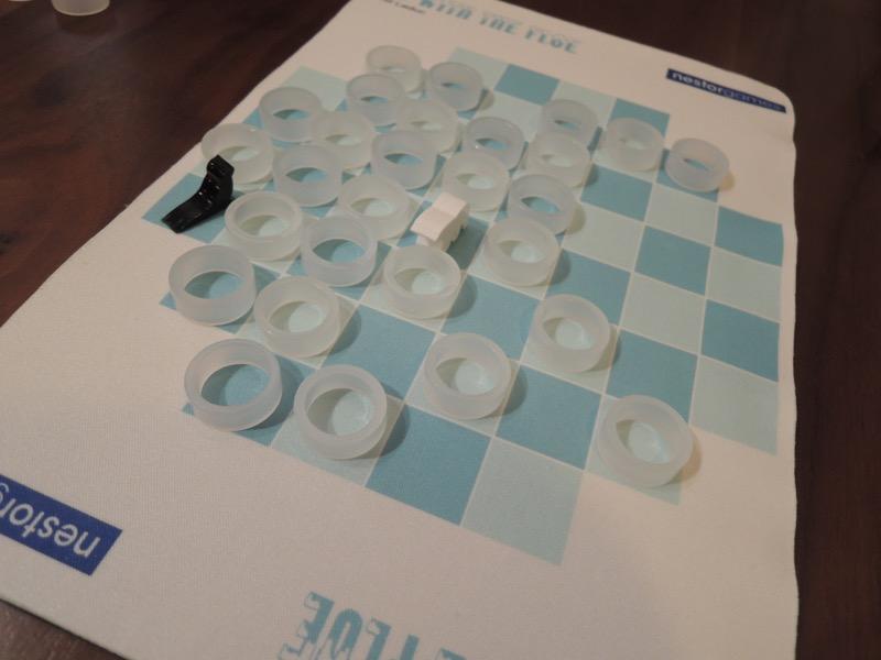 まずは初級ルールで、次に全部のルールを加えた上級ルールで行いました。さすがに自分のコマも裏返るというのはいまひとつな気がして、3戦目は中級ルールで、そして最後は自分の提案で1x2のコマをすべて除外してでの中級ルールで遊びました。1x2を取り除くことで防御のやり方の可能性を広げたかったのです。もう少し試してみないとわかりませんが、悪くないバリアントだと思います。ポリオミノを使ったゲームは数多くありますが、それをひっくり返すという斬新さが良いですね。1983年製にしては良くできていると思います。