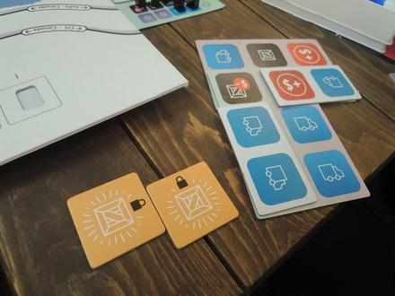 スマートフォンを世界中に売るというテーマのゲームです。5ラウンド制で各ラウンドは8フェイズに分かれていますが、そのうちの最初のフェイズである計画フェイズでそのあとどこにどれだけ力を入れるかをすべて決めます。どういうことかというと、各プレイヤーは2計画をビッドするための小さな2x3の長方形ボードを2枚組み合わせて、見えるシンボルの数だけそれぞれのフェイズの行動をするというわけです。このボードは全員同一の2枚を持っているのですが、表裏でシンボルの組み合わせが異なり、また必ず1−4つのシンボル分を重ね合わせなければならないのでなかなか思うように行きません。スマートフォンなのになんだかスマートではないですが、ここが一番ゲームっぽいところです。シンボルによって値付け、生産量、1x2追加ボードの獲得、技術競争、世界への輸送ということがすべて決まるわけです。また、そのすべてにおいて、値付けで最も低い値段のプレイヤーが優先されるために、ここを誤るとかなり悲惨です。今回も値付けを間違えて、初プレイの自分と名人が散々な目に合いそうだったので、仕切り直しをしました。