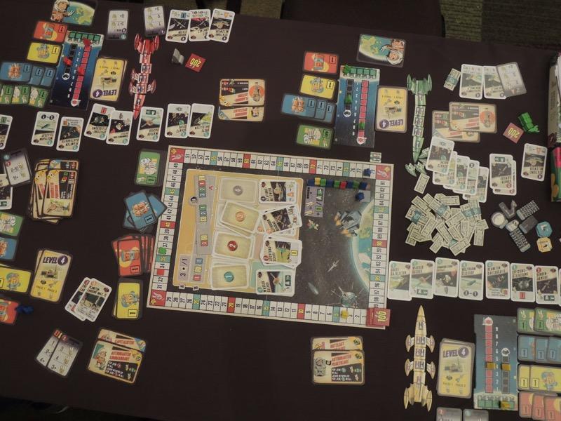まずは、エリックによるラマの洗礼! この日は計5回遊びました。まずはデリック、JRと3−4人プレイを3回、そして「セカンドチャンス」のあとでジェフやアマンダと2回遊びました。初プレイのプレイヤーが多いためか、なんと5回中4回も1位になれました。とくに3戦目は最終的な無失点(途中で失点しましたが、全部戻せた)です。ラマは大人気で色々なテーブルで遊ばれていました。