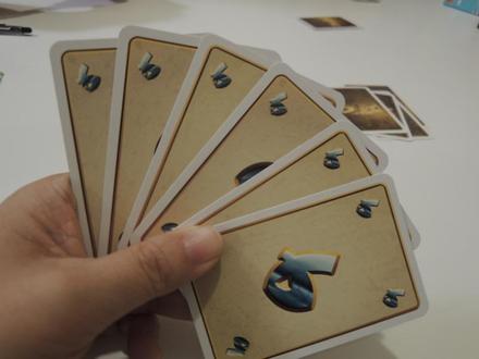 BGG.Spring以来の「ミスカトニック大学」です。もうすぐ日本語版も出版されるようです。手番では、1枚めくるか、ラウンドから降りるか、という2択なのですが、各自7種類の特殊カードがあり、これをうまく使ってセットを完成させたり、バーストを回避したりします。基本ゲームを遊びましたが、次回は特殊カードが1種類増える拡張ルールを遊んでみたいものです。