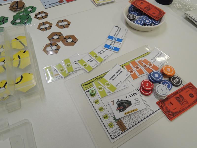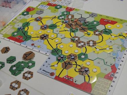 この日の1841は5人プレイです。自分にとっては初めてのv2(バージョン2)です。キュネオのTC(いわゆる卵)が大会社になっており、価値が高くなりました。IRSFFは2つの大会社に分裂するのですが、ここはv1ルールを使って小会社2つとしました。いろいろな組み合わせができるように、コンポーネントが豊富に付いてくるようです。
