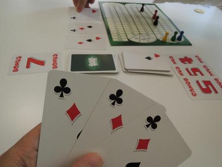 前回かなり人気があった「カテナ」です。4の列は諦めて、3の列で2個置くか、2の列で1個高い数値を置くかという作戦です。1は10に勝てるものの数字が低いので最後のタイブレークで負けたりと、思ったよりも複雑です。中盤までまったくコマを置けずに、結局自分は2点だけ。まここさんがダントツで勝利。