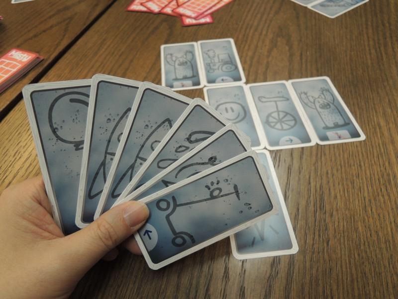 この日のヘルベチク小箱シリーズの2つ目です。曇った窓ガラスに描いた絵という変わったテーマのゲームで、各プレイヤーは3x4、または4x3の12枚のカードを並べて窓を完成させます。これはブースタードラフト方式(1枚選んで残りを左隣りのプレイヤーに渡すという方式)によって行われます。カードは特殊能力を持ったものが幾つかあり、横に並べると得点が高くなる花、またその花を除去してしまうモンスター、そして上下左右に移動するカードがあります。12枚並べた後、カードの指示通りに移動を行い得点計算です。