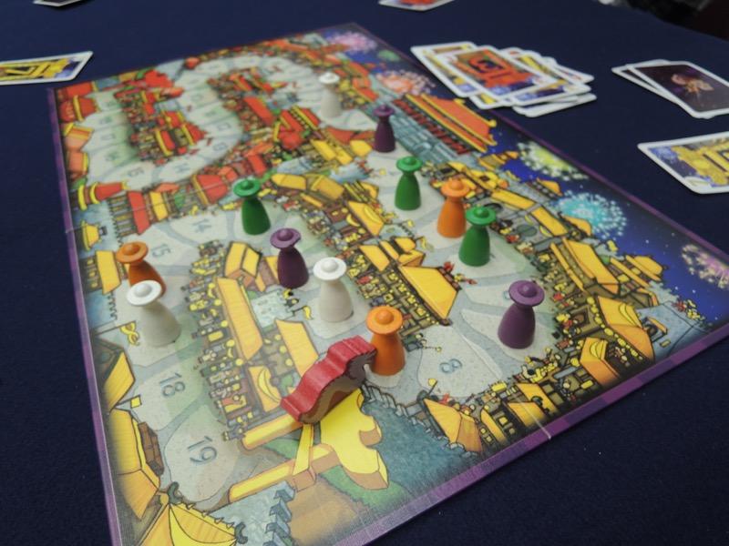 横浜クニツィア会で遊んで、ちょっと面白い気がしてきたドラゴンパレードを再び遊びました。たっくんはカジュアルプレイヤーとこのゲームをよく遊ぶそうですが、Z−MAN版とはカード裏やボードの色が少々異なるので興味深そうに観察していました。ドラゴンの通る道がZ-MAN版だと黄色ですが、ピアトニク版だと灰色です。4人プレイで4ラウンド。最終ラウンドでようやくイズナさんがドラゴンの位置をぴたりと当てて5点獲得。これで全員ほぼ同じ得点で終わることになりました。