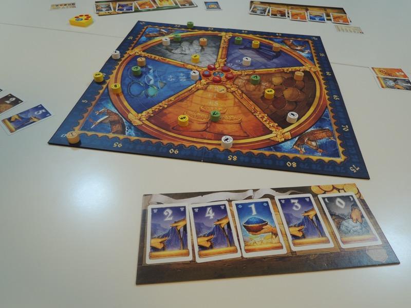 この日の最初のゲームは「エルドラド 黄金の神殿」です。まずは中級の「Die Zwickmühle/Imbalance ジレンマ/不均衡」を4人で遊びました。ウサギさんがたいまつ5のカードや黄金7のカードなど、高価なカードをたくさん買っていましたが、それらが本領を発揮する前に逃げ切ってゴール!