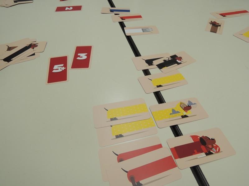 ヘルベチクの小箱のひとつ。6種類ある犬の頭と胴体を組み合わせてダックスフントを作ります。頭は各種3枚しかないので、出すタイミングが考えどころだと思われますが、なにしろ手札運が非常に大きくてなすすべもないまま負けてしまいました。ほかに最長、最短のダックスフントを完成させるとボーナス得点や失点があります。さすがにこの手のゲームで5人は多いと思うので、3人で試してみたいですね。
