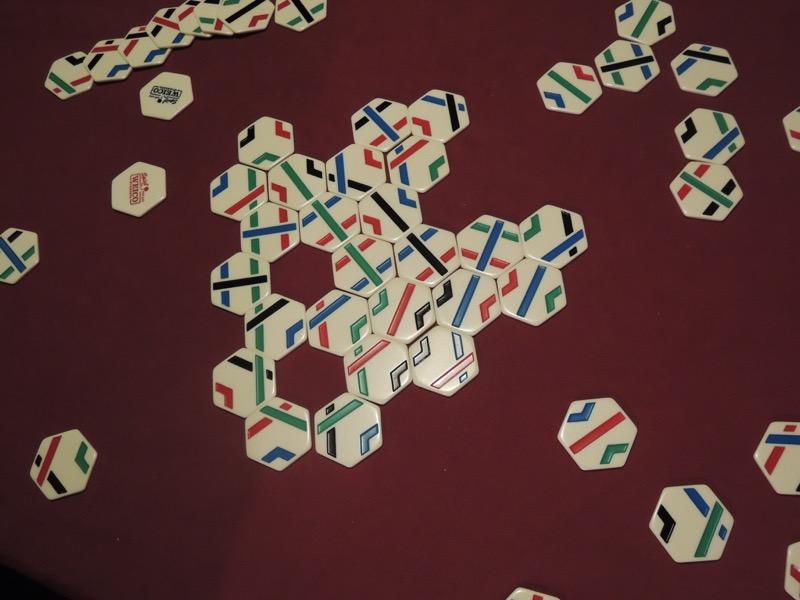 タイルには4色(赤青緑黒)のうち3色で6角形の2辺同士が結ばれています。これを整合性を崩さないように配置して、どの色でも良いので5枚以上からなるループを作れば勝ちです。「パラゴ」や「トラックス」からみると、ほとんどアクティビティーといっても良いほど収束も悪く、最後はなんとかループを作って終了させようという協力ゲームの様相を呈していました。みんなが言うように「ザクソ = The Kuso」なのかもしれません。