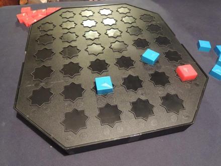 目的は自分の王を含んだ五連を完成させるか、あるいは相手の王を取ることです。ただし相手の王は自分の王が盤上に登場していなければ取れません。ボードは空の状態でゲームを始め、手番にはコマを打つか、既に盤上にあるコマを移動するかのどちらかです。とけいさんと遊んで2戦2勝。無から始めるので、毎回展開が非常に異なるのが良いですね。詳細レビューはここ。