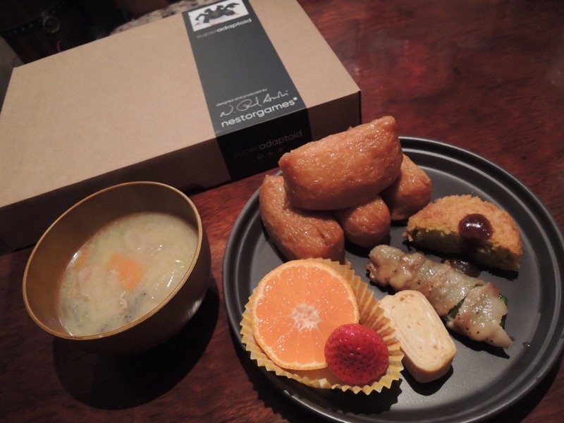 大きなダイスの鹿威し(ししおどし)のギミックが目を引くゲームですが、根本になるのはリソース変換とセットコレクションです。大中小のダイスを筒に落としていき、一定の重さになるとこれまでのダイスが出てきます。なので、自分でダイスを振るのではなく、この鹿威しにダイスを振ってもらうのです。ルールではどうなっているかわかりませんが、筒に入れる勢いによって、ダイスの大きさの組み合わせが同じでも出てきたりでてこなかったりします。どの組み合わせで出てくるのかは研究の余地があるかもしれません。出てきたダイスでリソースを集めてカードの条件を満たして得点、というここからはよくあるゲームです。ここで土嚢ランチで一休み。