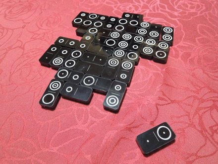 フィリット大会の4・5戦目(前述)を戦ったあと、ネスターゲームズの2進数ドミノ (double-seven binary-coding dominoes) を使って幾つかゲームを遊びました。