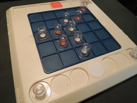 2000年くらいにプレゼントとしてもらった「オクティ」です。あまり面白くないと思っていたのでこれまで眠っていたのですが、今回初めて面白さがわかってきました。「アダプトイド」のように、自分のコマにペグをつけていくのですが、これが進める方向を示します。相手のオクティスクエアを3つ全て制覇すれば勝利なのですが、うっかりしているとあっという間に相手に占領されてしまいます。今日一番の傑作かもしれません。30分くらいかかる中量系のゲームです。