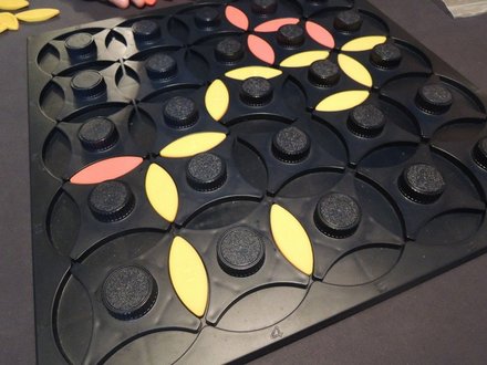 最近土嚢の会でよく遊ばれている「ファイア&アイス」です。全体がファノ平面と呼ばれる射影平面になっていて、それぞれの頂点が小さなファノ平面になっています。ファノ平面は7個全ての頂点が埋まると必ずどちから1人だけが3連を獲得するという性質があり、これによって獲得した小さなファノ平面によって全体で3連を作れば勝利というわけです。