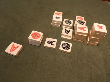 さらに同じ出版社から数年前に出た「ニボス」です。面白いことにエッセンの会場ではエリックも自分も「クサー」の方が「ニボス」よりも良いゲームだという意見だったのですが、土嚢の会では「ニボス」の方が人気がありました。配置のルールが少々曖昧で、隣り合うというのが段差があるときを含むのか含まないのかがよくわかりません。現地で直接教わったときには、段差があるときでも同色は隣り同士に配置できないという厳しいルールでしたが、今回は結構ゆるいルールでも遊ばれていたみたいです。どちらのルールが作者の意図するところなのか興味があります。