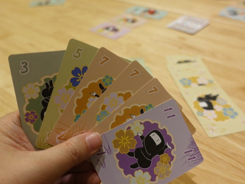 自分以外が全員連続してカードを出さなかったら(カードを取るかパスだけだったら)場のカードがすべて流れて、自分から次のラウンドを始められます。こうして同数値のカードを上手く集めながら、非公開と公開の手札を処理していきます。誰かが手札を無くしたらボーナスで+5点、その時点で他のプレイヤーは手札(公開&非公開)で同数値のカード枚数に対応した三角数で失点となります。