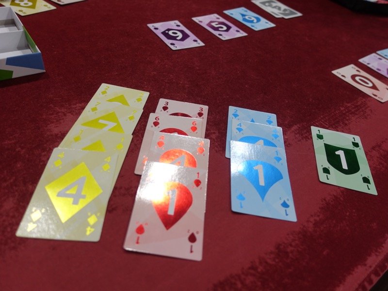 自分は2色を多く取り、最終的に他の色のどれかを1枚しか取らない、という戦略で戦いました。2色が同枚数になればプラスが2倍になります。うまくいかなくても一番少ない色を1枚にすれば最低限のマイナスに済みます。