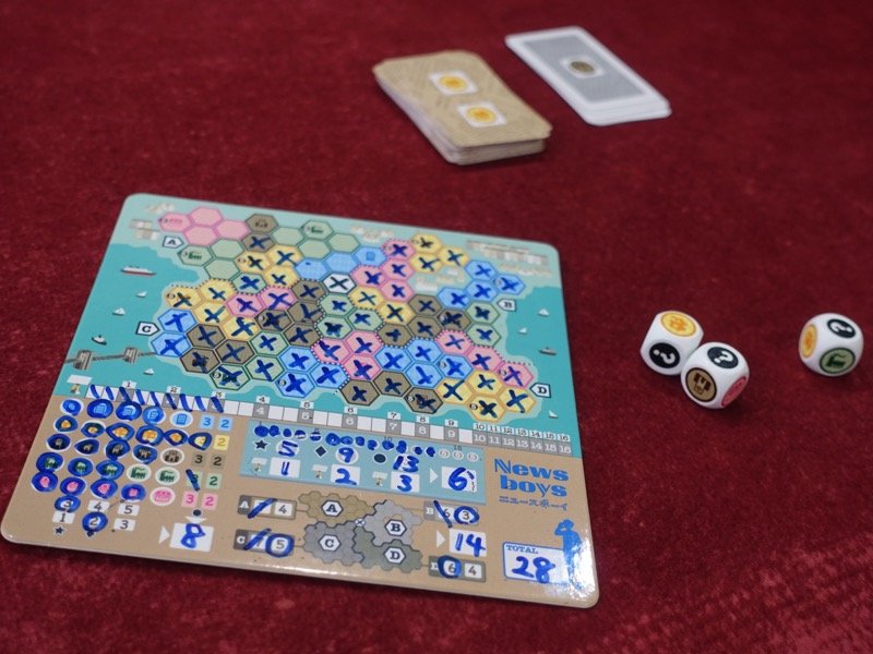 2回目のプレイです。個人ダイス3個と共通カード2枚のシンボルを使って個人ボードを埋めていきます。ダイスは振り直し1回が可能。ストライキとお金の得点方法がちょっとややこしいです。前回はお金が得点になるけど、その上限はストライキの数まで、ということでしたが、どうも逆みたいです。今回は4エリアを最初に埋める競争にことごとく負けてしまい最下位。
