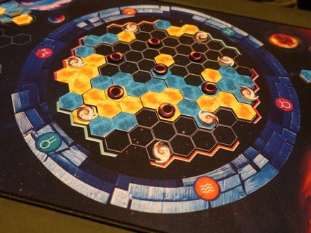 久し振りに参加してくれたあやかすさんと「オリオンデュエル」を2戦しました。どちらもかなり接戦で良い戦いでした。特に2戦目は周囲がすべて銀河、そして中央がすべてブラックホールという配置で、ブラックホールを避けるように配置するのが大変でした。1勝1敗。