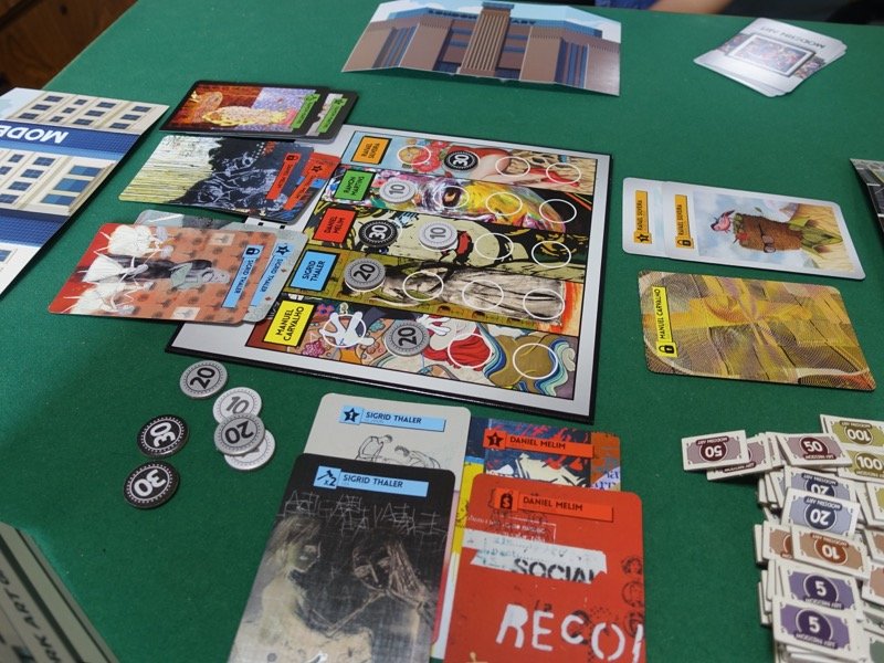 久し振りに遊ぶ「モダンアート」です。使用したのはCMON2016年版です。ライトメタルに当たる黄色のカードが多めだったので、黄色を育てたかったのですが2回もラウンド終了をさせられてしまい流れを作れませんでした。黄色を出す余裕がなく手持ちの5枚くらいは死蔵してしまいました。かなり苦しい展開で最下位。優勝は初プレイの片岡さんです。さすがです。