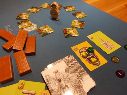 手番には袋からガラス玉を取り、それによって一度に達成しなければならないミッションの数が決まります。ミッションにはタイルを素早くめくって目的のタイルを探すもの、積み木で指示された形を作るもの、袋から(見て良い)特定の色の組み合わせのガラス玉を取るもの、などがありますが、ときどき全員が参加してよい中央のコマを取る、というのがあり、ちょっと「フロッテフロッセ」を思い起こさせます。