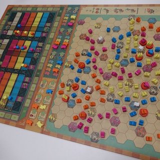 まずは「ラー」です。アバクス・リオグランデ版はボードに英語とドイツ語の両方でタイル構成と得点表があるのが特徴です。今回は文明3種やモニュメント同種3枚などが揃ったのですが、それ以外はさっぱりでした。序盤にファラオを頑張ったものの2ラウンド目以降では追いつけず。それでも2位につけることができました。