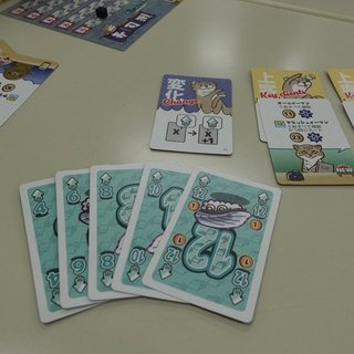 ここで4人になり、再び林尚志氏のゲームとして「すしオッター」を遊びました。カワウソが寿司を握っているイラストが可愛いゲームです。手札8枚から最大5枚のポーカーハンドを作っていき、各ハンドにはスコアと勝利点があります。この用語が非常に紛らわしいのですが、スコアはカードの金貨などによって足されることもあり、スコアが最も高いプレイヤーから順位点として勝利点がつきます。また自分だけの手役など、様々な特殊カードがあるあたりは、おかずブランドっぽいなあと思います。自分は序盤に手に入れたイーブンフラッシュ(すべて同スートで数値が偶数)という役を2回作ったのですが、3回目がうまくいかずに沈んでしまいました。