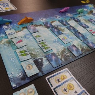 見栄えが良くてとっつきやすいゲーム、と思って持ってきたのがこの「ゴーゴーエスキモー」です。なんといってもエスキモーのコマ(もふもふ付き)や白熊のお尻が可愛い! しかしゲームはシビアで、自分の思い通りとタイミングでラウンドが終わらず、このゲームで久し振りに最下位になってしまいました。