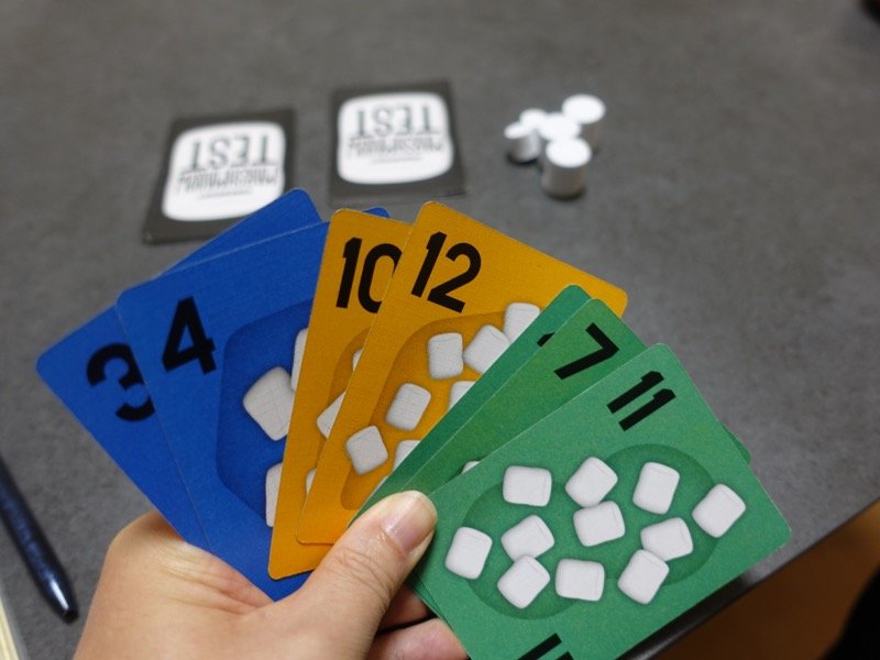 何かトリックテイキングゲームをやろうということになり「マシュマロテスト」を遊びました。「ブードゥープリンス」との違いの一つにリードスートを持っていても、既に切り札がそのトリックでプレイされたら切り札をプレイしても良い、というのがあります。今回はこのゲーム固有のルールが活きて、自分が切り札を出して取ろうとしたら、まさやんさんが、さらに高い切り札を出してオーバーラフをする場面がありました。最後に勝ちきれずにまさやんさんが目的の20点を達成して勝利。