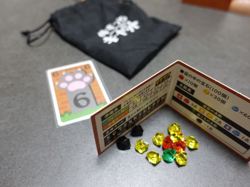 宝石をできるだけ多く獲得するゲームです。毎回5−16個の宝石を場に置きます。各宝石は色によって1−3点の価値があります。各プレイヤーは手札から1−6の数値カードのいずれか1枚を伏せて自分の前に出します。スタートプレイヤーから順に伏せたカードを表にして、その数値に等しいだけ場から宝石を取るのですが、他のプレイヤーが既に公開した数値と同じならば、場からでなはくそのプレイヤーから宝石を奪います。また場から取る宝石の数が足りなければ、マイナス1点となる石ころを不足分だけ取らなければなりません。スタートプレイヤーを2回ずつやったら(3−4人の時)終了です。