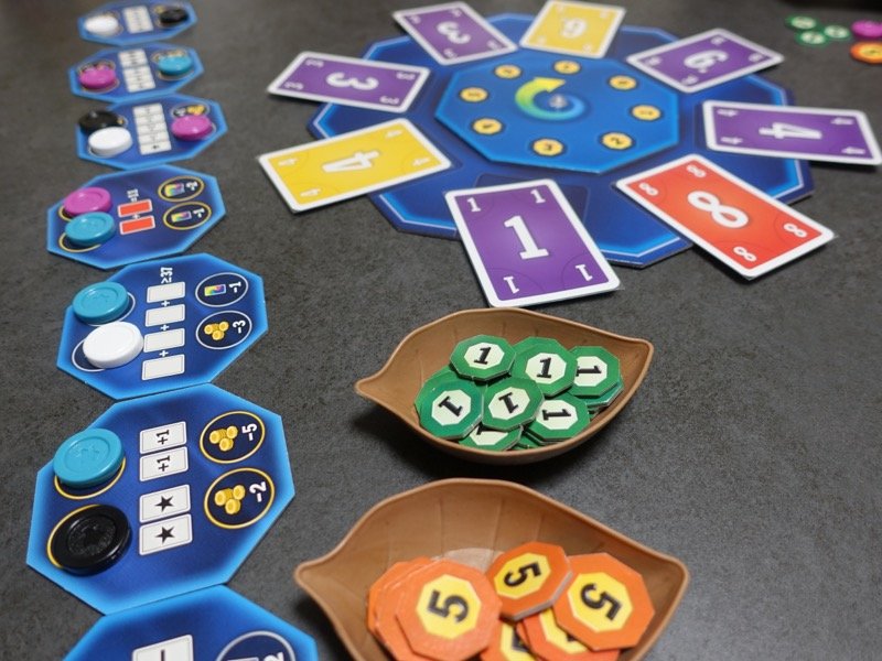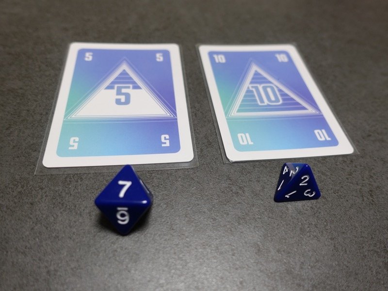 特徴的なのはダイス。各プレイヤーは正4、6、8面体の3つのダイスを持ちます。出目をカードの代わりとして使ったりカードの数値に加えて使ったりできます。パスをすると振り直しもできます。ただし全部使ってしまうと手物に戻ってくるので要注意、さきにカードを使い切るか同時に使い切らなければなりません。点数はダイスを振って決めます。1、2、3番目に上がったプレイヤーから、それぞれ3、2、1個のダイスを振った合計が得点になります。