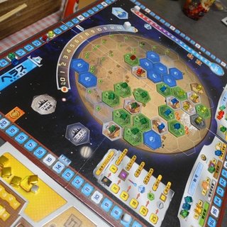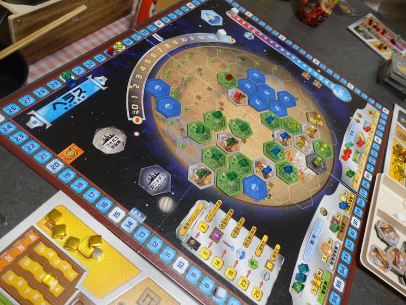 みつるさんの提案とみんなの意見もあって「テラフォーミングマーズ」を遊ぶことになりました。1年半前の前回のときはエリシウムでしたが、今回はヘラス。また「ヴィーナスネクスト」は使わず、新たな拡張カード「プレリュード2」が含まれていたようです。「コロニーズ」からは、月、タイタン、ガニメデ、カリスト、ミランダ、トリトンの6つの衛星が使われました。