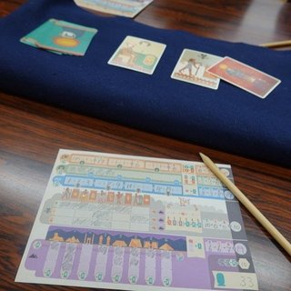 ブースタードラフトのゲームです。右隣りのプレイヤーから回ってきたデッキから1枚選んで自分の前に配置してデッキの残りを左に回します。食材とレシピの2種のデッキを交互に回すというのが新しいところです。これらを市松模様に配置して、レシピカードの色々な課題をなるべく多く達成していくのです。プレイヤーインターアクションはほとんどなく、自分の最高点を目指すので精一杯。でも2位になれました。