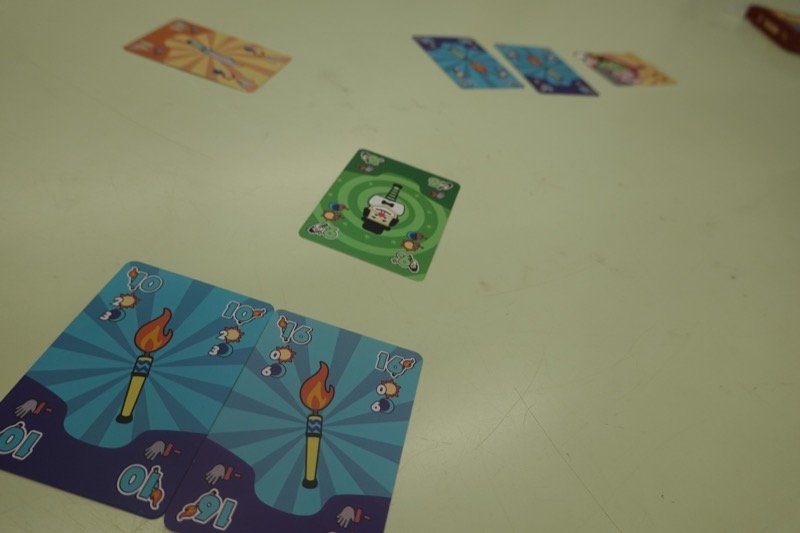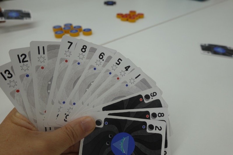 マストシンボルフォローですが、トリックの勝者は現在優勢な色のハイカード(同値は後出し勝ち)、優勢な色がなくバランスが取れていたらリードのシンボルのハイカード(同値は後出し勝ち)です。テーブルの中央に赤と青のトークンが7個ずつあり、自分がカードを出した後にこれらのトークンを取ってカードに乗せることで色を変えることができます。トリック終了時に中央に残っているトークンで多い方が優勢な色になります。