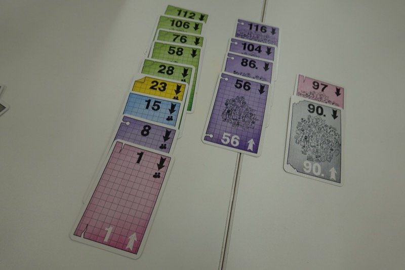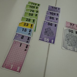 クラマー&キースリングのカードゲーム。場にある6枚のカードが数字順に円環上に並んでいます。手番には手札から1枚を円環の該当する場所においてその左右どちらかのカードを取って自分の場に並べます。自分の場には3列しか並べられず、しかも昇順か降順でなければなりません。円環では最小の1と最大の126はつながっていますが、自分の場ではつながっていないのです。各列の点数はその列の枚数とその列の最大枚数の色の枚数の積なので、できればなるべく同じ色で多くのカードを同じ列に並べたいものです。カードは6色あり、6の剰余系で同色になっています。