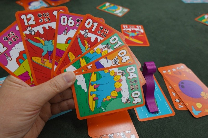 山札には4枚(初級レベルなので)のビーストカードが含まれており、これらはスートのみで数字はありません。手札にこれらがあるときは必ずプレイしなければなりません。1の位のところに配置し、1の位にはそのスートのカードを置けなくなります(次のビーストカードは10の位に置いたのですが、このルールは間違っていたようです)。なお各スートには通常と金継ぎの2種があり、ビーストカードによる制限もこのどちらか1つだけです。もし1の位に既に同スート同種のカードがあれば、ビーストは10の位に置かれます。ここでも同様にすでに同スーと同一カードがあれば100の位に、さらには盤外へとすべての位が合致すればビーストを退治できるのです。退治できなかったらずっとゲーム終了まで居残ります。
