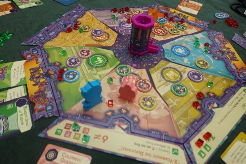 手番の始めにカードで7つの時空のどこかがドクター・フーのいる時空として示され、その両隣りを含めた3つの時空にリフトキューブ(亀裂キューブ)という悪いキューブを置きます。これがミニダイスタワーのようなギミックになっており、穴に落としたキューブが3つの時空のどこに行くかはコントロールできるようでできません。なお、キューブの数はドクター・フーのいる時空にあるディスク(これも除去したい対象)の数+2です。
